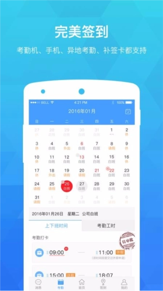 2、考勤状态颜色清晰分明,在日历页面上,除了呈现周期和日期外,白班、请假、外出等各类信息也以丰富的文字颜色进行显示。