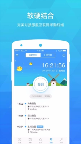 5、增添两个便捷的签到服务栏目,并且在签到中心设置内勤签到与上报位置这两个栏目。