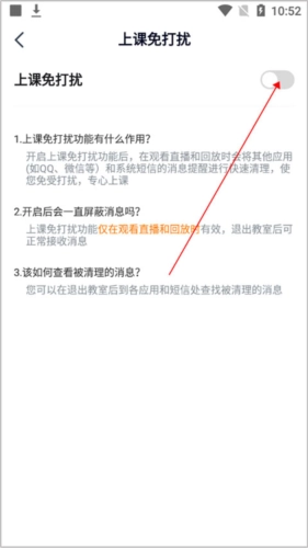 4、进入上课免打扰界面,点击“上课免打扰”右侧的按钮来开启该功能。