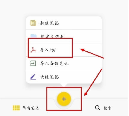 1、在首页底部中间位置,能看到黄色的“+”选项,点击该选项会弹出一系列选项,接着选中【导入PDF】。