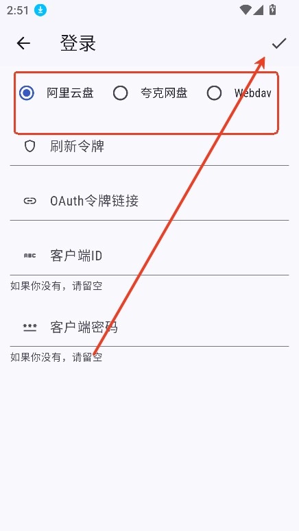 4、输入云盘、令牌密码以及客户端密码,点击右上角的“确定”按钮即可。