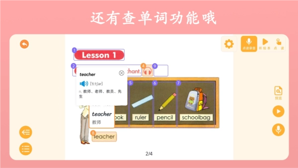 2、绘本不仅具备点读功能,还能针对特定单词进行查字典操作,并且拥有关键单词的学习功能。