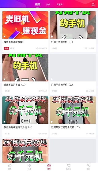 用户点击下方种草,即可进入手机资讯页面,用户可以查看视频推荐、可乐优品商城头条、买家秀的手机资讯内容。