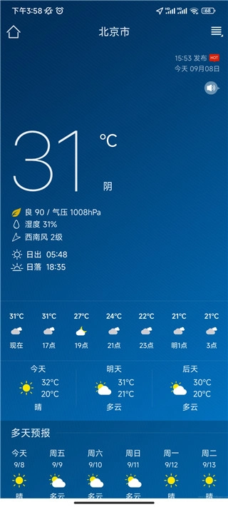 1、手机天气预报涵盖全面的天气信息,包括15日天气预报、24小时天气预报、空气质量指数、空气污染指数、pm2.5、风力、湿度、温度、日出日落时间、气压以及能见度等。