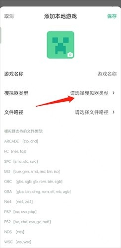 3、首先输入游戏名称,接着挑选模拟器类型,最后选定文件路径。