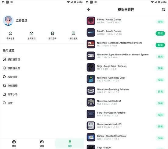 其他方面,你注册账号后,能够将游戏上传至平台,还能进行游戏互传。在模拟器管理板块,可以看到众多游戏的模拟器,你可对其进行安装与卸载操作。