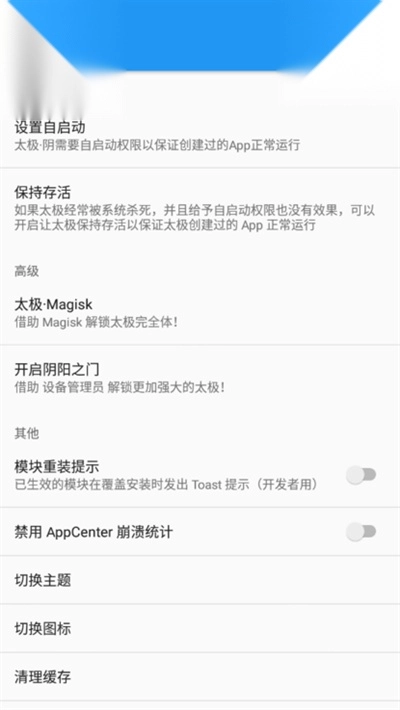 太极可能已被系统终止运行,也可能是你未赋予太极自启动的权限。你可选择将太极添加至系统内存清理的白名单中,并允许太极自动启动。