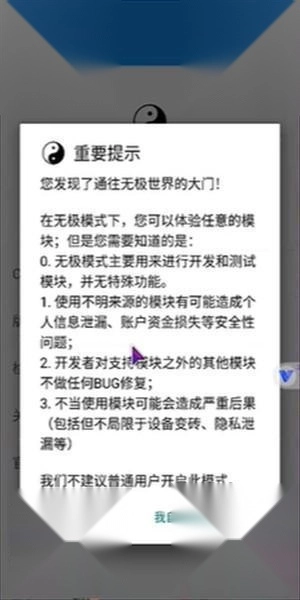 默认开启白名单,除太极之外,不会对其他方面产生任何影响;具备弱侵入性,不容易被检测到;对于来源不明的模块,为保障安全,无法使用。