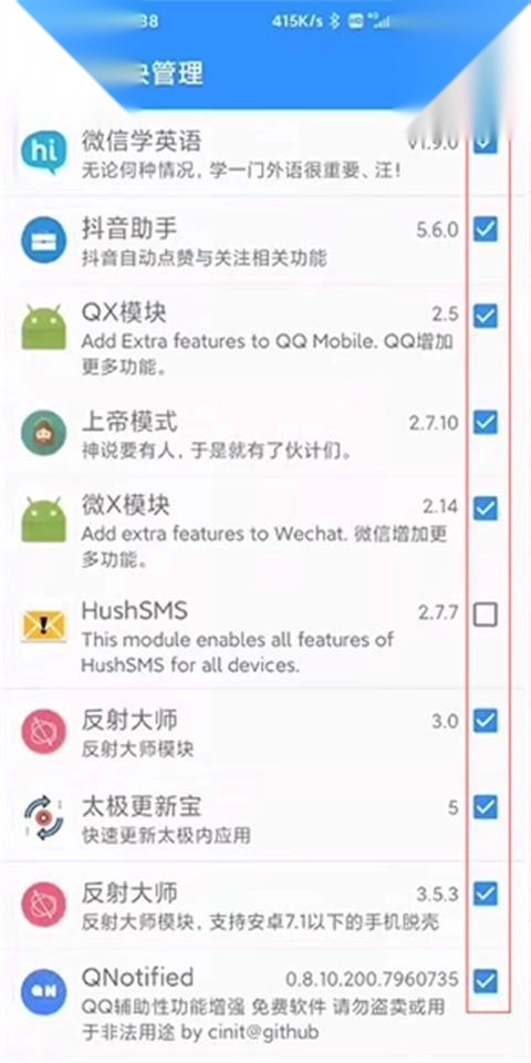 在模块管理界面打开后,便能瞧见已安装的模块。当勾选某个模块时,系统会提示该模块所支持的应用版本。另外,应用版本在太极主界面同样能够查看。若版本不兼容,模块将无法使用。