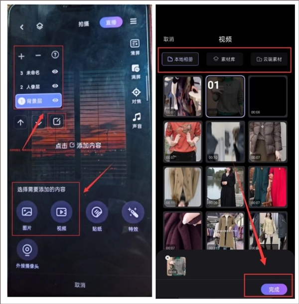 (2) 背景层编辑环节,能够添加图片或视频,你可挑选自己的商品视频。