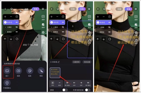 (6)接着添加图层,能够添加卖点字幕,这就需要自行制作一张文字的PNG格式透明图片(利用PS添加文字,删除背景层,保存为PNG格式,若不清楚具体操作可自行百度)。完成直播间设置后,点击右上角的“直播”。