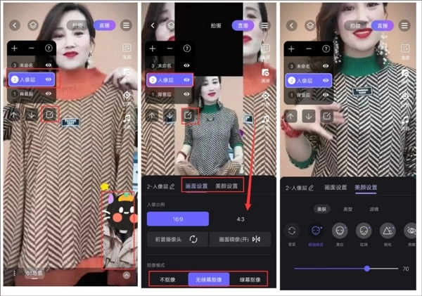 (4)切换至人像层,通过双指缩放来调节人像大小,长按并保持不松开便能拖动其位置,随后进行画面设置与美颜操作。