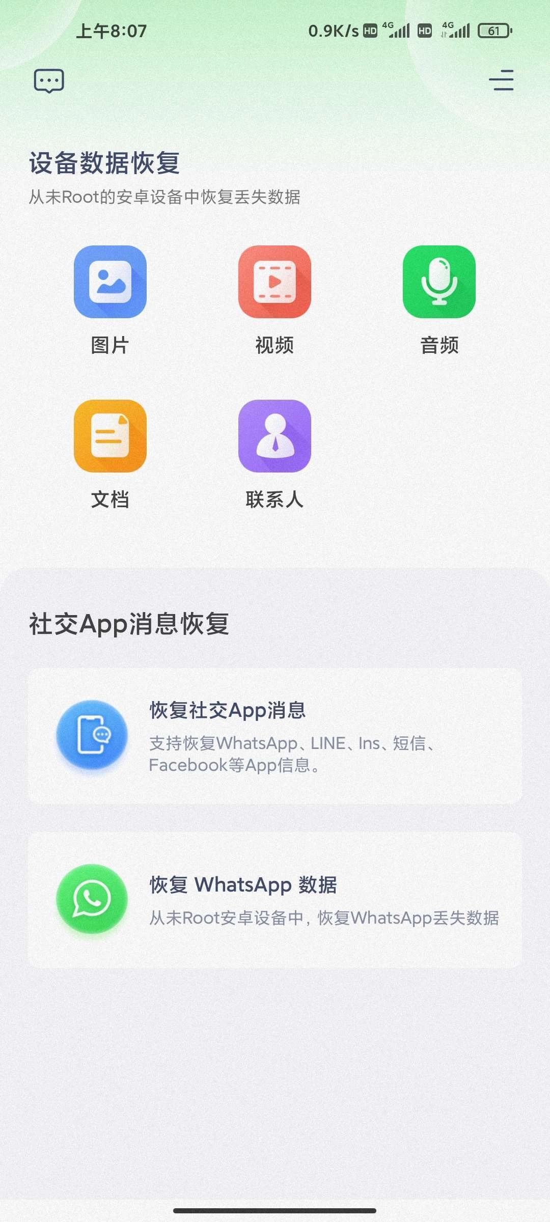 4、音频恢复:助您从微信、WhatsApp Business、Viber、Line等平台中恢复音乐,查找丢失的音频文件。恢复过程无需对设备进行root操作。