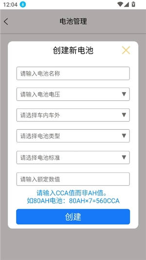 4、在此处输入电池名称,选择电池电压、车内或车外、电池类型等参数。