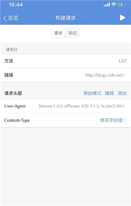 1. 点开菜单栏,寻找到构建请求选项,把方法头设定为get,通过模拟请求来访问CSDN博客,同时对请求地址进行配置。