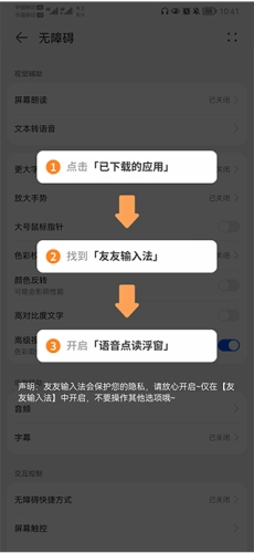 三、语音点读:于输入法键盘界面点击开启点读,点击之后会跳转至手机设置,同时开启友友输入法悬浮窗。
