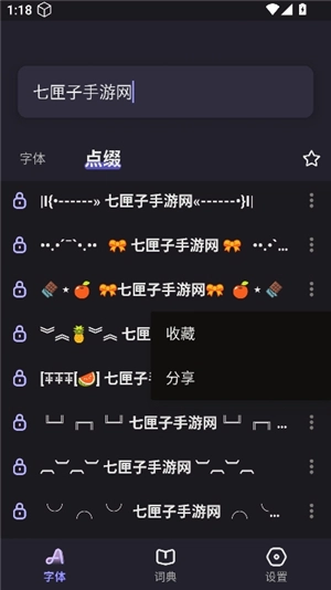 3、轻点文字右侧的三个小点,便能对花样文字进行收藏或分享操作。若想复制花样文字,直接点击文字即可。