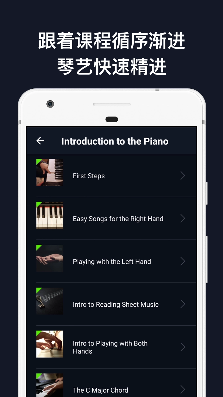 - 超1000首曲目,涵盖从初级到高级、从古典到流行等多种类型,任你挑选。通过你喜爱的乐曲学习钢琴演奏。