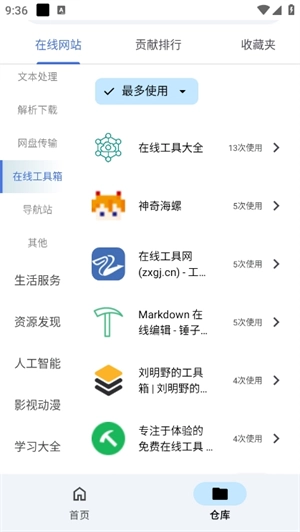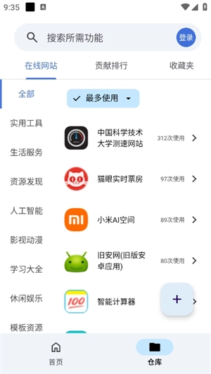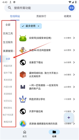 5、仓库页面集成了全网各类热门在线网站功能,涵盖在线影视、人工智能、资源等方面。
