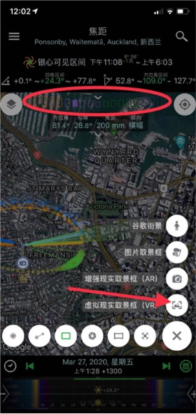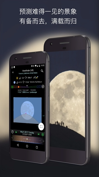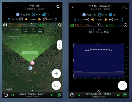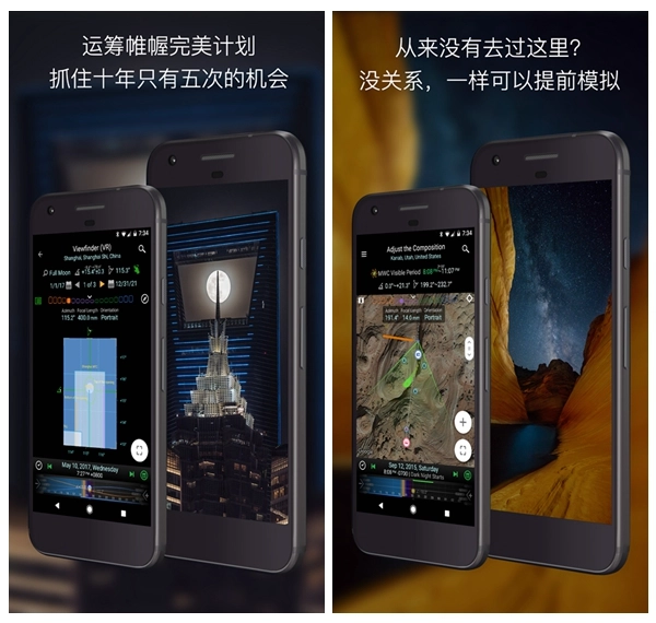 在Planit!中,能够模拟呈现摄影师所熟悉的取景框。它不仅支持虚拟现实、增强现实、图片以及街景模式,还配备了星历信息覆盖层。