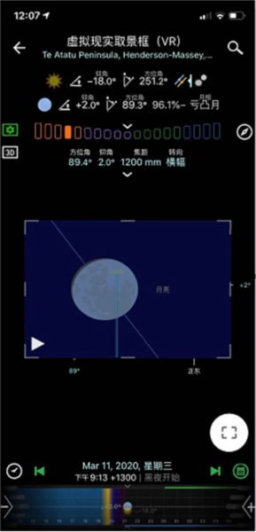 5、屏幕左下角设有时间按钮,轻按一下,便会显示当前时间。若拖动滑块,就能看到月亮的移动轨迹。下面展示的这张图片,呈现的是使用1200mm(600mm镜头搭配2倍增距镜),在距离12公里之外所拍摄到的效果。