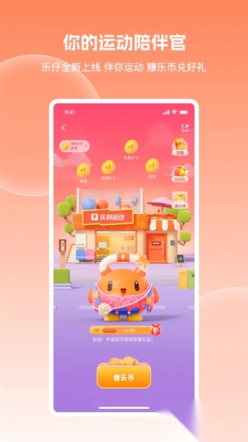 2、首页全新上线每日心情互动文案。下拉页面至二楼,就能找到你的专属运动陪伴官——小乐仔。它不仅会陪伴你运动,你还能通过互动赚取乐币,兑换各种好礼。