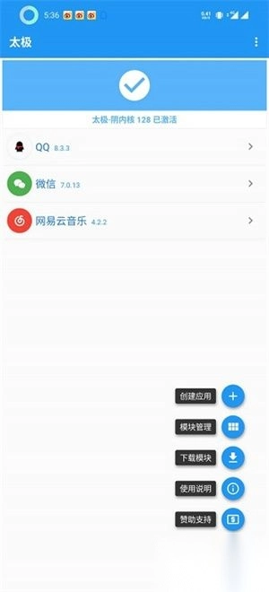 1. 打开太极,若能看到“太极内核已激活”,便意味着可正常使用。点击右下角按钮展开,能看到创建应用、模块管理以及模块。