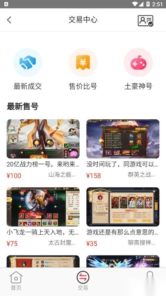 2、这里为玩家提供游戏账号及游戏道具交易服务,玩家可在此购买心仪的游戏账号。