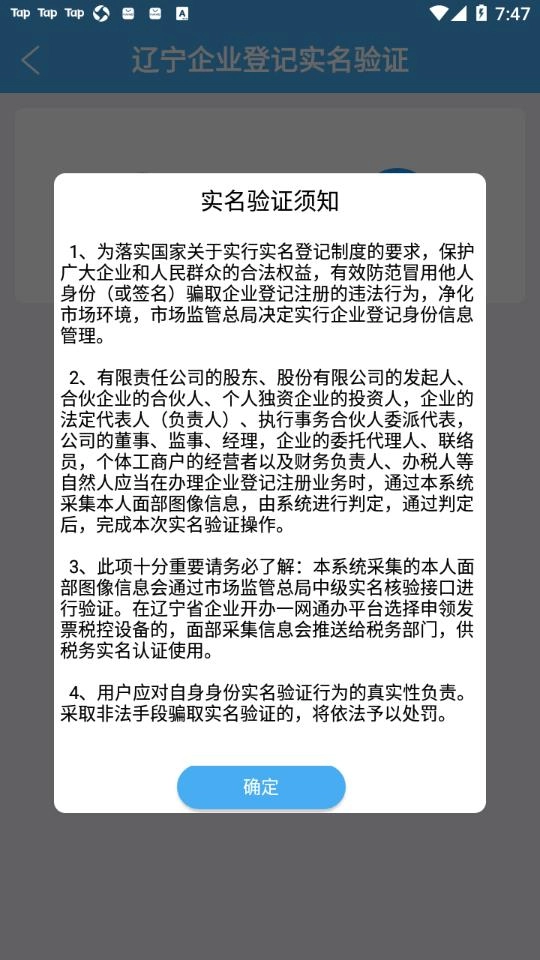 3、请务必了解,此项十分重要:本系统所采集的本人面部图像信息,会经由市场监管总局中级实名核验接口予以验证。若在辽宁省企业开办一网通办平台选择申领发票税控设备,面部采集信息将会推送给税务部门,用于相关事务。