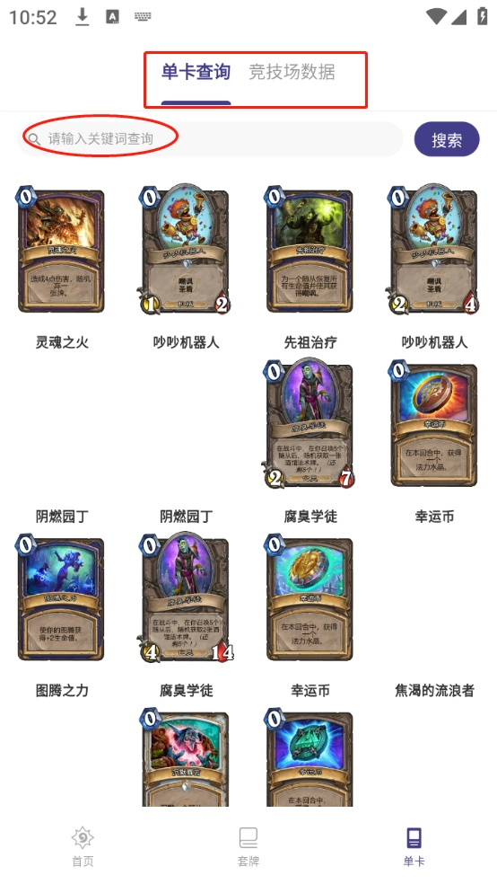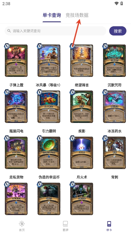 3、好奇某张卡牌的强度与用法?进入“单卡”功能页面,一键查询,还能搜索竞技场数据,助你轻松构建最强卡组!