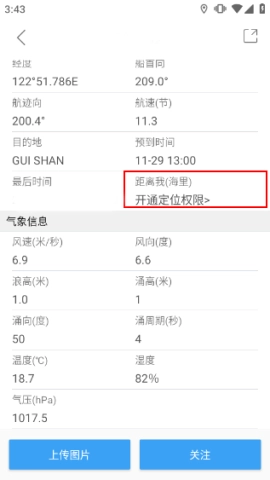 4. 轻点“信息”按钮,便能获取船只的航速、经纬度、目的地等众多微档案信息。不仅如此,还能够实时监测与当前位置的距离,不过在此之前,需要先注册并登录账号,而且要启用定位功能。