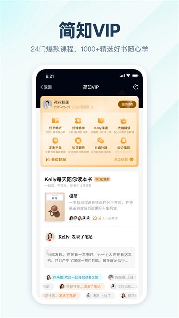 如今,简知已坐拥百万付费用户。一直以来,它专注于提供丰富多样的学习内容,像听书 VIP 年度学习计划、大咖精品课、专题学习、训练营、书院等综合性产品一应俱全,助力用户系统搭建知识体系,做到学以致用,切实解决实际问题,成就更优秀的自己。1、【听书VIP】