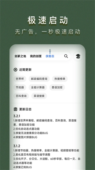 在最新版本中,侠客工具箱又增添了世界杯赛程、邮政编码查询、百科查询、菜谱搜索、兽语加密等实用功能。若您有相关需求,欢迎前来本站尽情体验使用!1、【工具合集】便捷实用,满足你的需求