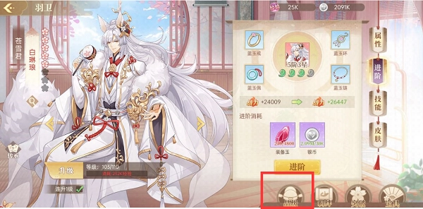 通过消耗装备玉与银币,能够对羽卫进行进阶操作,进阶后羽卫的战斗力将会得到提升。