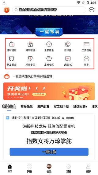 1、打开博时基金,直接进入首页,里面有非常的的功能,比如识别钱包、博乐智投、全部基金、目标盈等等