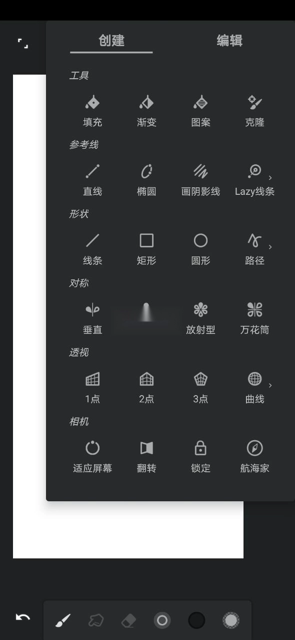 3、轻点右上角圆规形状的图标,展开后能看到诸多工具,这些工具主要划分为绘画和编辑两大类别。