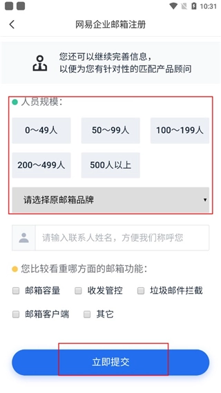5、接下来,选择人员规模与原邮箱品牌等信息,便可完成注册啦。