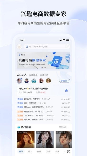 【热门直播 实时监测】实时呈现直播间流量走向、带货动态;挖掘直播畅销商品,完善直播选品方案。