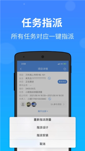4. 项目流程管理:在待指派、待测量、待安装、待验收、已验收以及已关闭等所有项目流程阶段,均可进行查看与编辑操作。