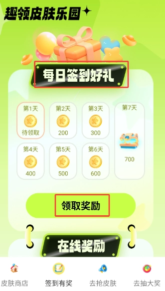 3、在每日签到专区进行连续打卡,可获取游戏点券、限定皮肤碎片等累计奖励。