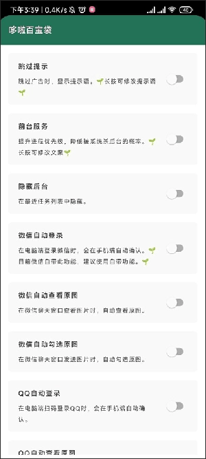 7、在这个哆啦百宝箱中,我们能够设置跳过提示、前台服务、QQ自动登录等功能。操作很简单,只需打开功能对应的开关即可。