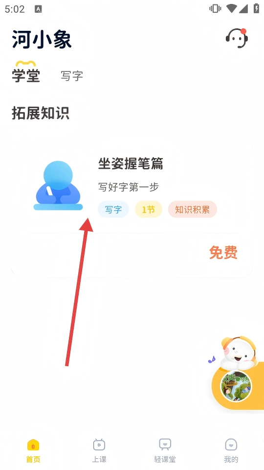 2. 在坐姿握笔篇的课程列表里,点击【河小象坐姿握笔规范】这一课程,就能进入课程详情页面。