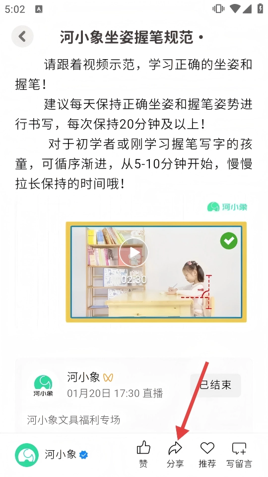 3、于课程详情页面,能够观看【河小象坐姿握笔规范】教学视频,并且还能够借助底部的【分享】按钮,把该课程分享给其他人。