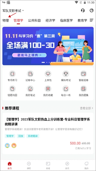 1. 凭借手机号与验证码注册并登录账号,进入软件主页面的【练习】模块。首先留意页面上排名第一的科目,即管理学,知悉后点击右边红色箭头所指之处。
