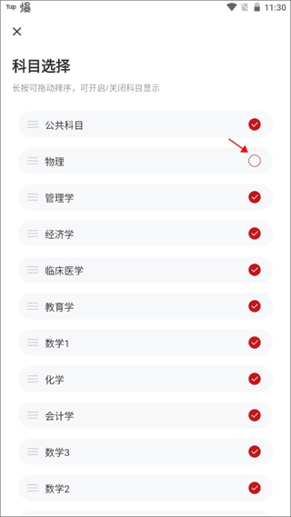 2. 用手指长时间按住其中一个科目,待将其排至第一位后再松开手指。