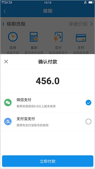 3、需支付续期差价以及到期服务费,支付方式涵盖微信与支付宝。