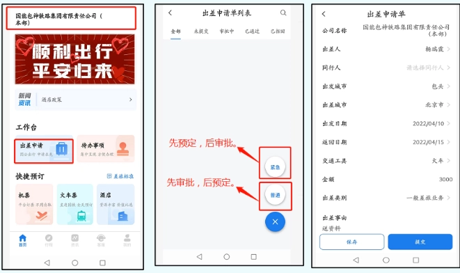 在商旅平台中,特别设置了“紧急”类型的申请单。一旦处于紧急状况,相关人员提报该申请单后,便能即刻在商旅平台进行资源预订,后续再补充完成审批手续。