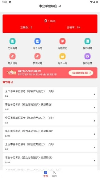 2、首页集合了各类丰富的答题板块,其中包含历年真题、综合练习、我的错题以及同步训练等。