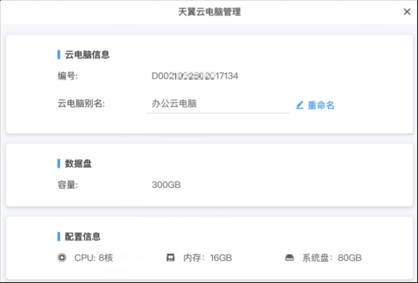 在云电脑的选择列表中,点击“管理”选项,就能查看云电脑的配置信息,还能够对云电脑的名称进行编辑。