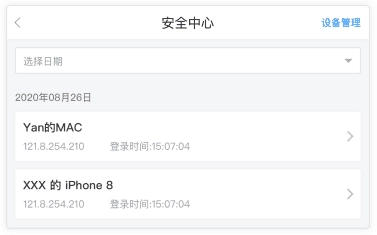 (2)在“安全中心”首页,点击右上角的图标,即可进入“设备管理”。在“设备管理”的列表里,能够查看所有曾登录过的设备。
